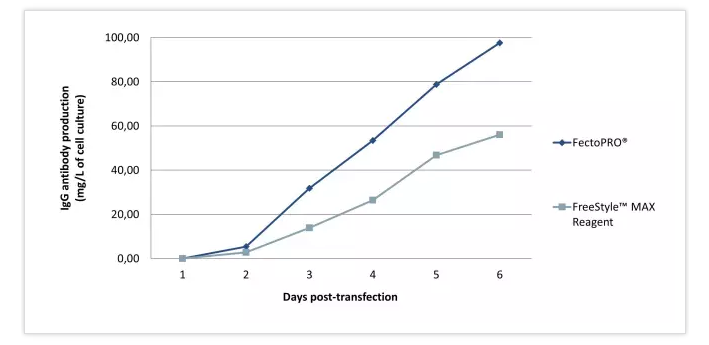 過去幾年,蛋白質(zhì)生產(chǎn)的持續(xù)時間有所增加,大部分蛋白質(zhì)生產(chǎn)過程持續(xù)1~2周,以獲得最佳的蛋白產(chǎn)量。FectoPRO?確保幾天內(nèi)產(chǎn)生持續(xù)的蛋白產(chǎn)量,同時保持較高的細胞活力以延長蛋白生產(chǎn)。