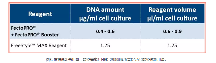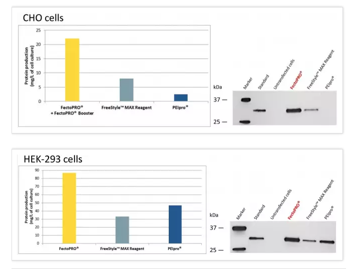 圖2. FectoPRO?大幅提高懸浮CHO和HEK-293細胞的蛋白產(chǎn)量。按1×106個細胞/ml的密度將FreeStyle? CHO-S和HEK-293F細胞培育在30 ml的無血清培養(yǎng)基中,并依照每種試劑說明書推薦用量FectoPRO?+FectoPRO?輔助藥劑Booster (0.4 μg DNA/ml)、FreeStyle?MAX試劑(1.25 μg DNA/ml)或PEIpro?(1 μg DNA/ml)進行轉(zhuǎn)染。用蛋白質(zhì)G親和性定量法(HPLC)和Western Blot檢測轉(zhuǎn)染后72小時(CHO細胞)和120小時(HEK-293細胞)的IgG3-Fc (34 kDa)的產(chǎn)量。