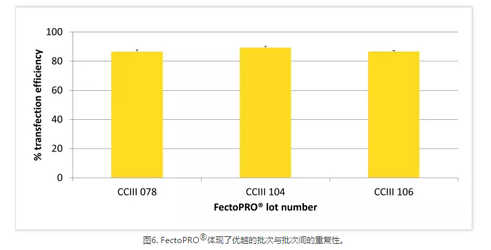 高質(zhì)量質(zhì)粒DNA的制備成本非常高,尤其是在進行大規(guī)模蛋白質(zhì)生產(chǎn)時需要大量的DNA和許多質(zhì)粒。FectoPRO?通過使用0.4~0.6 μg/106/ml的細胞培養(yǎng)液將DNA成本縮減了40%~60%,使其成為生物制藥生產(chǎn)流程的一項經(jīng)濟實惠的選擇。