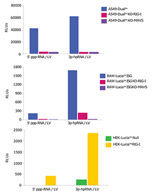 ISG對RIG-I配體的反應(yīng):使用300 ng/ml的5’ppp-dsRNA或30 ng/ml的3p-hpRNA刺激衍生自A549的細胞;使用1 μg/ml 5’ppp-dsRNA或3p-hpRNA刺激衍生自RAW和HEK293的細胞。經(jīng)過孵育過夜,可使用QUANTI-Luc?檢測上清中Lucia熒光素酶活性的相對光單位(RLUs)以測試ISG的反應(yīng)。