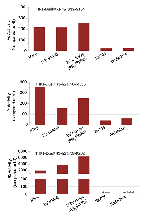 功能獲得(Gain-of-function)的活化-THP1-Dual? KI-hSTING-S154細胞和THP1-Dual? KI-hSTING-M155細胞均均可以持續(xù)活化ISG,而THP-1-Dual? KI-hSTING-R232卻不能。加入IFN-β或STING激動劑將進一步促進ISG的活化。注意,結(jié)果已被非刺激細胞背景信號標(biāo)準(zhǔn)化。因為其持續(xù)活化STING的特性,SAVI細胞的背景非常高,誘導(dǎo)ISG應(yīng)答的增加倍數(shù)低于R232對照細胞。
