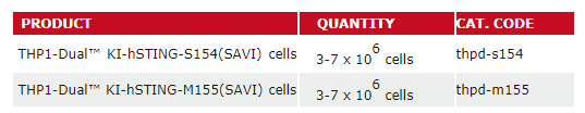 InvivoGen提供給一系列基于人源THP1單核細胞系的STING突變體的報告基因細胞株。其中,有兩款表達STING- associated vasculopathy with onset in infancy(SAVI)的功能獲得性突變體(S154 and M155)。SAVI患者在STING蛋白中顯示出單一突變,導(dǎo)致其持續(xù)激活和ISG的過度活化。S154是新生突變[1],M155是遺傳突變[2]。STING SAVI報告基因細胞株是篩選STING通路抑制劑便捷有力的工具。