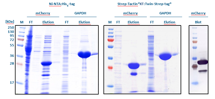 以SDS-PAGE分析發(fā)現(xiàn),不管是mCherry或是GAPDH,使用Strep-tactin? XT: Twin-Strep-tag?都能得到純度較高的目標(biāo)蛋白(見(jiàn)Elution)。Western Blot分析結(jié)果顯示,提取mCherry所出現(xiàn)的雜質(zhì)為其降解產(chǎn)物。