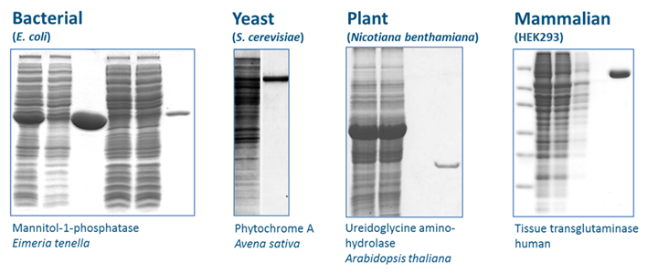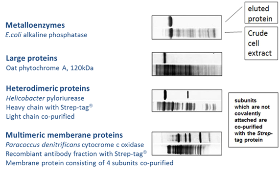 因His-tag系統(tǒng)使用Ni離子,所以在純化金屬蛋白(多數(shù)為酶)時(shí),可能會(huì)受到金屬間交互作用的干擾。而使用Strep-tag? 則不會(huì)出現(xiàn)此問(wèn)題,因?yàn)镾trep-Tactin? XT與Strep-tag?的特異性結(jié)合不受金屬離子影響。且因其溫和的純化流程,所以還能用于純化大型蛋白、多亞基的蛋白復(fù)合體或是跨膜蛋白,并且保持蛋白功能。以Strep-tag?系統(tǒng)純化出不同的蛋白實(shí)例如下: