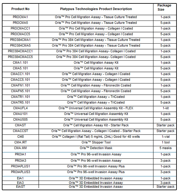 美國Platypus Technologies公司建立于2000年,是細胞分析領(lǐng)域產(chǎn)品的耗材供應(yīng)商,熱賣產(chǎn)品為OrisTM和OrisTM Pro系列細胞遷移和侵襲實驗試劑盒。其開發(fā)的用于檢測細胞遷移和侵襲的細胞排斥區(qū)分析法,克服了Transwell和劃痕實驗的缺點。