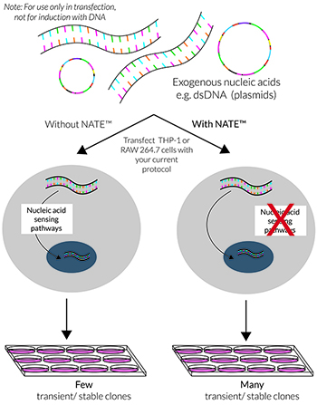 在真核細(xì)胞轉(zhuǎn)染期間,外源核酸(如質(zhì)粒DNA)的主要障礙是它們會(huì)被胞質(zhì)傳感器檢測(cè),如cGAS/STING,AIM2炎癥小體和LC3介導(dǎo)的自噬。這些防御性級(jí)聯(lián)信號(hào)的激活通常會(huì)導(dǎo)致低轉(zhuǎn)染效率、降低的細(xì)胞活力和不一致的結(jié)果,尤其是在難轉(zhuǎn)細(xì)胞(如免疫細(xì)胞)的轉(zhuǎn)染實(shí)驗(yàn)中。NATE?抑制許多核酸感應(yīng)途徑,從而保護(hù)外源DNA并促進(jìn)其表達(dá)。
