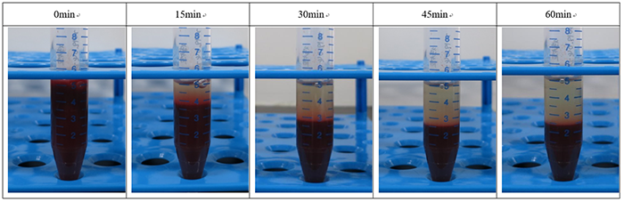 按照4:1的比例加入1mL 紅細(xì)胞沉降液,混勻,在室溫自然沉降。結(jié)果如下圖所示。
