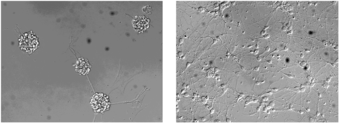 人Midkine增強(qiáng)了培養(yǎng)三天的大鼠胚胎(E18)皮層神經(jīng)元的神經(jīng)突起生長;左(未處理),右(0.4 μg/mL的人Midkine)