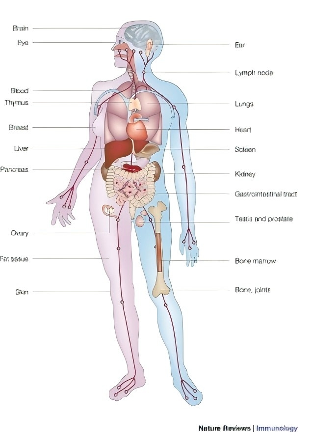 起初,T 細(xì)胞被認(rèn)為是免疫系統(tǒng)中 MIF 的主要細(xì)胞來源。然而,后來的文獻(xiàn)證明了單核細(xì)胞、巨噬細(xì)胞、血液中的樹突狀細(xì)胞、B 細(xì)胞、中性粒細(xì)胞、嗜酸性粒細(xì)胞、肥大細(xì)胞和嗜堿性粒細(xì)胞均表達(dá)MIF。值得注意的是,MIF 也由與宿主自然環(huán)境直接接觸的細(xì)胞和組織表達(dá),例如肺、皮膚上皮層以及胃腸道和泌尿生殖道。其另一個(gè)顯著特征是在內(nèi)分泌系統(tǒng)的幾個(gè)組織中高水平表達(dá),尤其是參與應(yīng)激反應(yīng)的器官(下丘腦、垂體和腎上腺)。