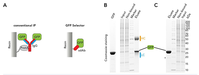 傳統(tǒng)的GFP融合蛋白免疫沉淀是基于與GFP特異性抗體非共價鏈接的protein A或protein G結(jié)合在固相,從而拉下蛋白的原理(見圖1 A),其產(chǎn)率和效率通常受限于一抗的特異性和固相上protein A/G的結(jié)合能力。通常,在用SDS緩沖液洗脫時,抗體發(fā)生變性并與GFP融合蛋白及相互作用的配體一起從樹脂上分離下來。因此,洗脫液中通常含大量一抗重鏈和輕鏈(見圖1 B),妨礙鑒定蛋白的相互作用,還有可能影響下游實驗,比如蛋白質(zhì)印跡或質(zhì)譜分析。