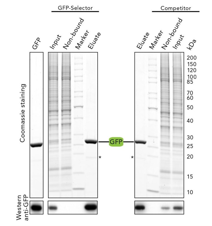 將等量GFP Selector和競爭產(chǎn)品與1ml含GFP標記蛋白的HeLa裂解物一起孵育,通過考馬斯染色和蛋白印跡分析上樣、洗滌產(chǎn)物、洗脫產(chǎn)物。