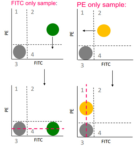 對于熒光補償?shù)拇_定,需運用以上補償?shù)幕驹聿⒔Y(jié)合特定的標(biāo)本來實現(xiàn)。以FITC,PE雙色分析為例: