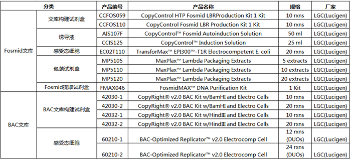 LGC(Lucigen)提供Fosmid文庫構建試劑盒,該試劑盒中的Fosmid載體是行業(yè)金標準(原屬于Epicentre產品),可完成各種生物樣本編制完整和無偏向的Fosmid文庫,利用自動誘導液保證單拷貝和誘導高拷貝數量的需要。