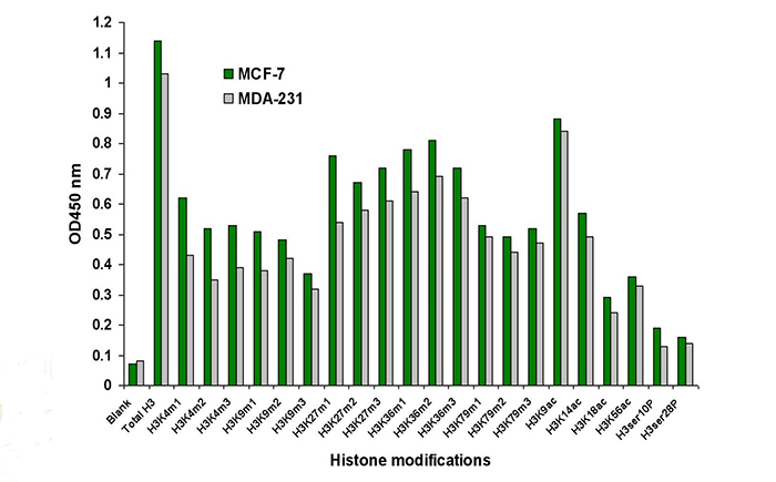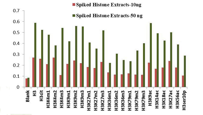 該試劑盒檢測(cè)H3修飾位點(diǎn):H3K4me1 、H3K4me2、H3K4me3、H3K9me1、H3K9me2 、H3K9me3、H3K27me1、H3K27me2、H3K27me3、H3K36me1、H3K36me2、H3K36me3、H3K79me1、H3K79me2、H3K79me3、H3K9ac、H3K14ac、H3K18ac、H3K56ac、H3ser10P、H3ser28P、TotalH3