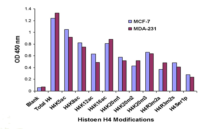 該試劑盒檢測(cè)H4修飾位點(diǎn):H4K5ac、H4K8ac、H4K12ac、H4K16ac、H4R3m2a、H4R3m2s、H4K20m1、H4K20m2、H4K20m3、H4ser1、TotalH4