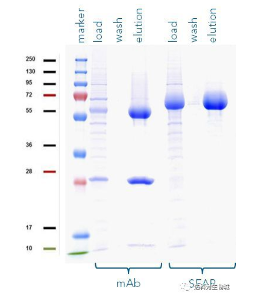 此外,我們也測試了其他的蛋白,例如SEAP(72 kDa)或抗體(mAb,其重鏈為55kDa)。圖B為以Strep-Tactin?XT純化SEAP-TST、mCherry-TST與mAb-TST的SDS-PAGE分析結(jié)果,可見對于不同蛋白,Strep-tag?系統(tǒng)都能純化出高純度的目標(biāo)蛋白。(注:紅色標(biāo)記處為 mCherry的降解產(chǎn)物,非雜帶)