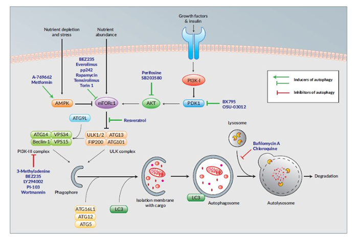 自噬是原生分解程序,由細胞內應激物(營養(yǎng)物和能量貧乏)引起。自噬由生成自噬體開始,這一步驟由一系列蛋白調控,包括VPS34型磷脂?;迹?/span>PI)3激酶復合體,隨后與溶酶體的融合將自噬體酸化。自噬的阻斷有多種形式,例如PI3激酶抑制劑可通過抑制自噬捕獲動作而阻斷自噬進程,或者用抑制溶酶體酸化的抑制劑阻止自噬溶酶體的形成和自噬降解。自噬進程是被縝密調控的。mTORC1,一種對營養(yǎng)物和生長因子敏感的激酶,是自噬的主要阻遏器。因此,mTORC1及其信號通路的抑制劑可誘導產生自噬。