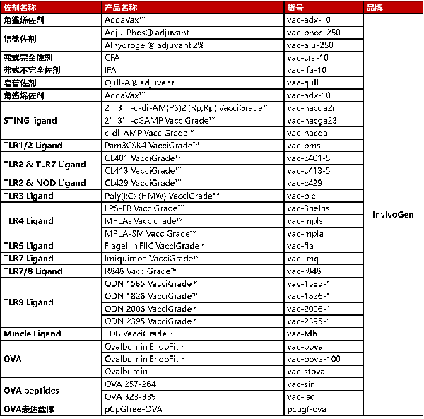當前,針對COVID-19的疫苗研發(fā)以前所未有的速度在世界范圍內(nèi)陸續(xù)開展,世界各地的科學家正在探索開發(fā)針對SARS-CoV-2的有效疫苗的所有潛在策略。大多數(shù)用于COVID-19的候選疫苗旨在誘導針對病毒S蛋白的中和抗體,防止病毒通過人ACE2受體攝取從而阻止感染。COVID-19疫苗開發(fā)前景的顯著特征是正在評估的技術平臺的多樣性,包括:減毒活疫苗,基于病毒載體的疫苗,基于重組蛋白的疫苗,DNA疫苗和RNA疫苗。其中重組蛋白疫苗通常使用SARS-CoV-2蛋白(例如S蛋白)在宿主中引起免疫反應。通常與佐劑結合使用以提高免疫原性。迄今為止,已進入臨床試驗的COVID-19候選疫苗包括Moderna開發(fā)的mRNA疫苗(NCT04283461)和康希諾 (NCT04341389)開發(fā)的重組腺病毒疫苗。此外,諸如AS03和MF59等佐劑正在重組蛋白疫苗中進行探索,使用佐劑可增強免疫原性并降低劑量,使更多人接種疫苗成為可能。天然免疫專家InvivoGen提供科研用途的佐劑和OVA產(chǎn)品供研究人員選擇。