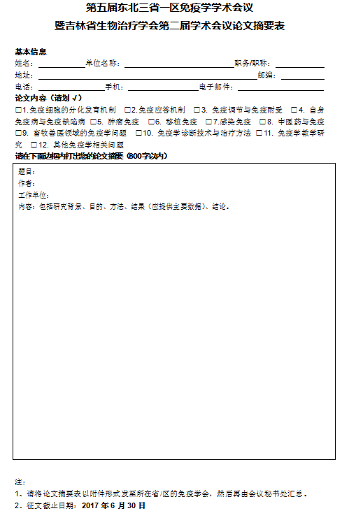2. 請(qǐng)使用《第五屆東北三省一區(qū)免疫學(xué)學(xué)術(shù)會(huì)議論文摘要表》撰寫來稿。